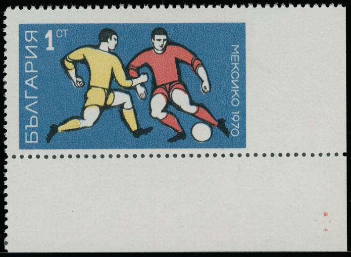 1970, World Soccer Championships in Mexico, 1st blue, black, red and yellow, bottom right corner sheet margin single imperforate at right, full OG, NH, VF, Est. $100-120 , Scott #1842 var