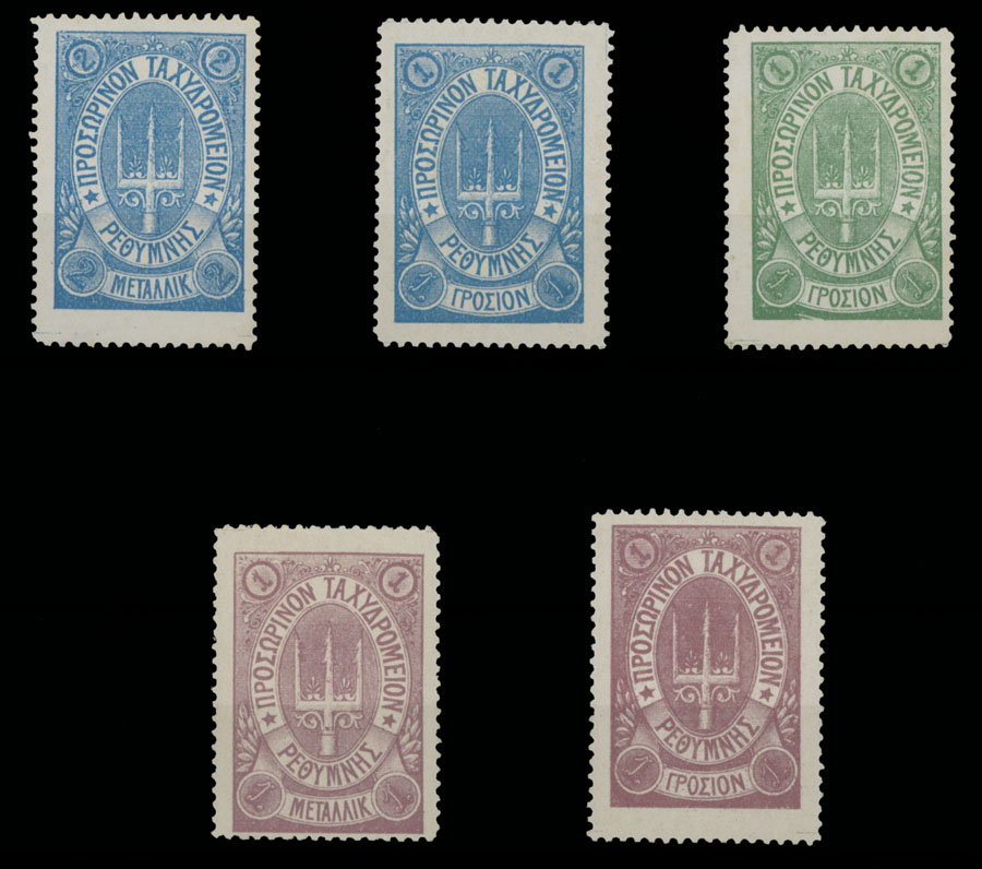 1899, Poseidon’s Trident with Stars, set of five different values without control handstamp, large part of OG (3) or unused, no gum, mostly VF, Karamitsos #46/53 var, Est. $150-$180 , Scott #36/46 var