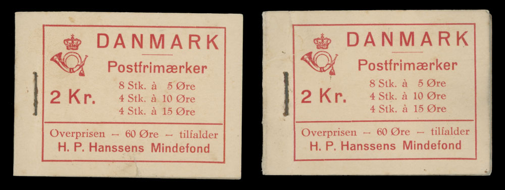 1937, Numerals, Caravel and Mill, two intact 2kr booklets, each one contains four panes of four values, 5o green (2), 10o brown (1) and 15o carmine (1), red text on yellowish paper, one has repaired tear at the bottom of front cover, panes are intact, full OG, NH and VF, C.v. $580 for panes only, Est. $200-$250, Scott #223d, 229b, 238Al