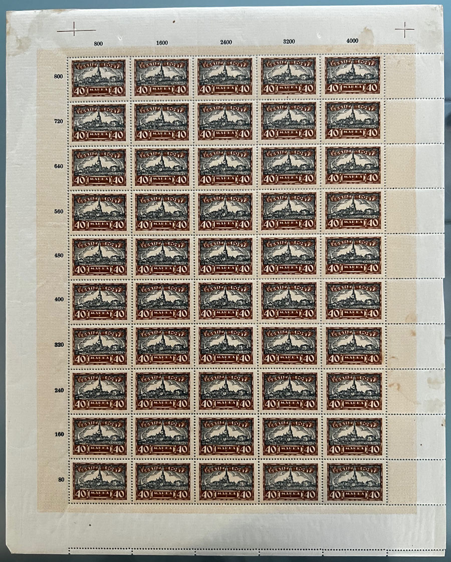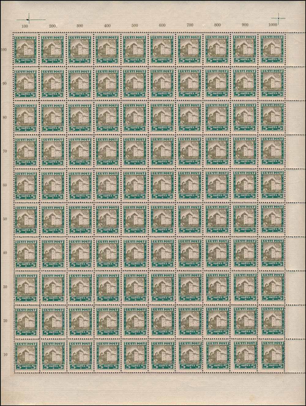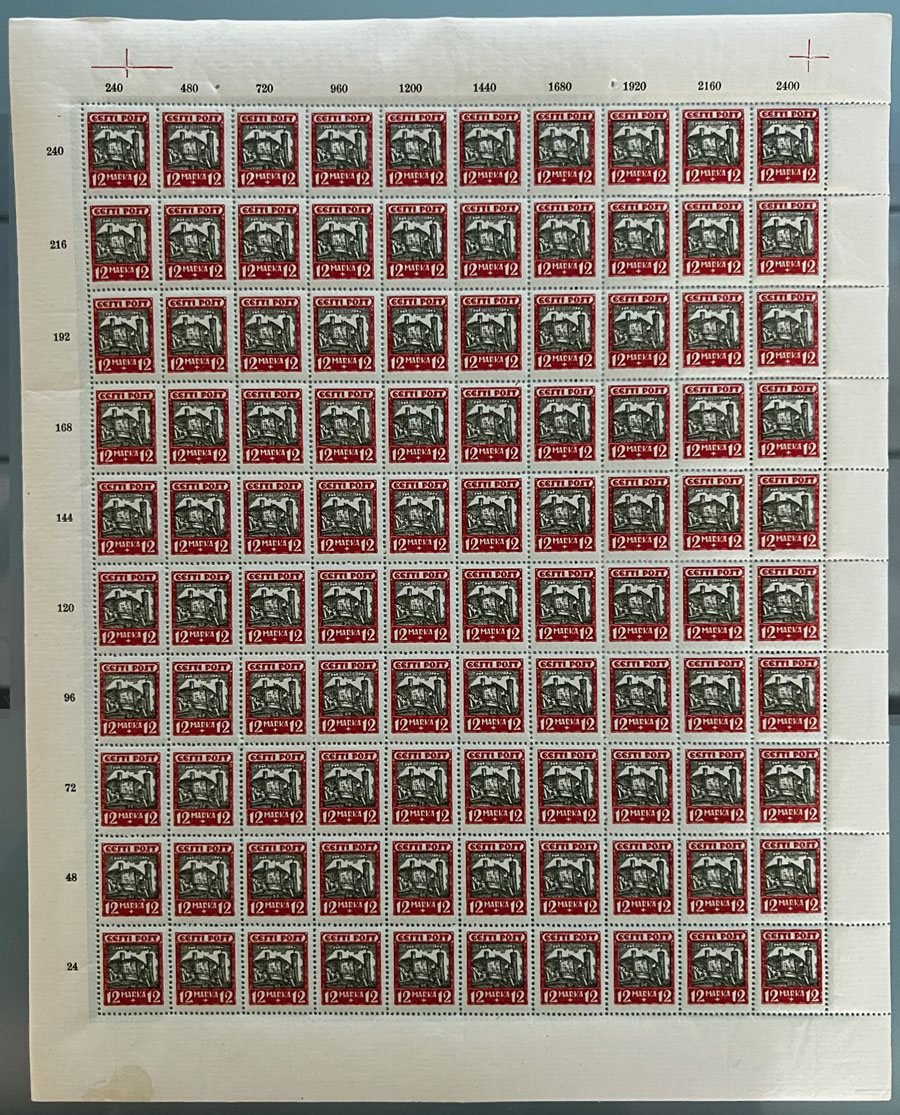 1927, Castles and Fortress, 5+5m- 40+40m, 100 complete sets of five, printed on horizontally or vertically (10m) laid paper, 5m, 10m and 12m are in sheets of 100 and each of 20m and 40m are in two sheets of 50, occasional selvage separations possible, full OG, NH, VF and scarce in complete sheets, C.v. $300 as hinged singles, Est. $150-$200, Scott #B15-19