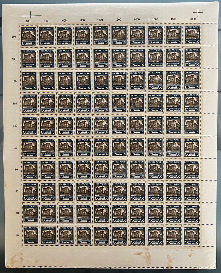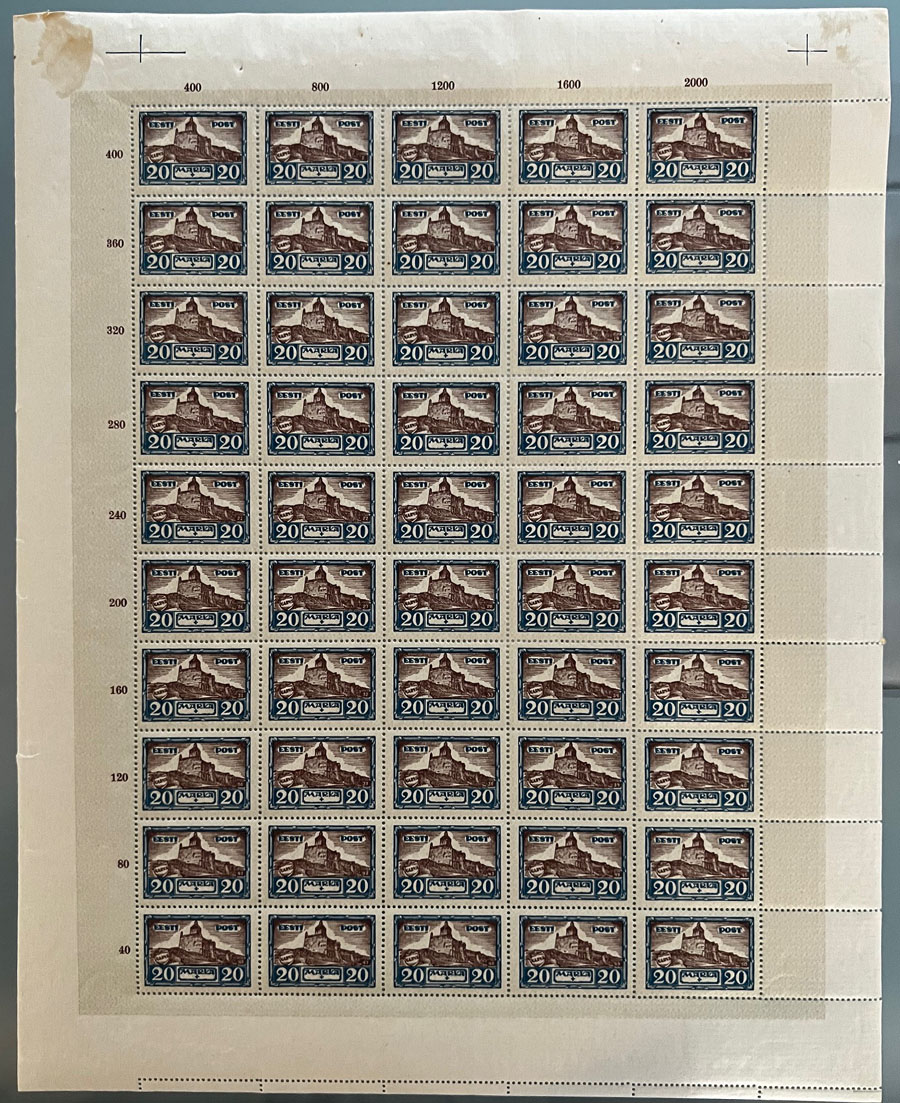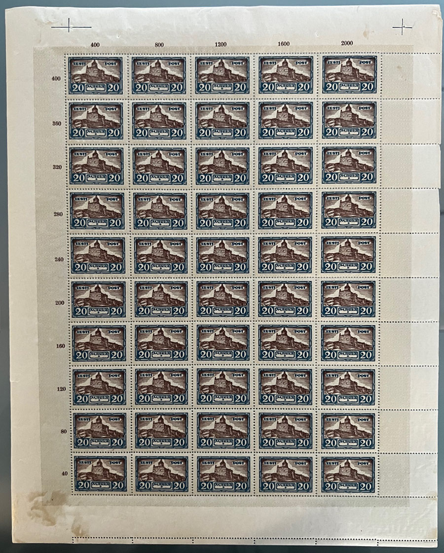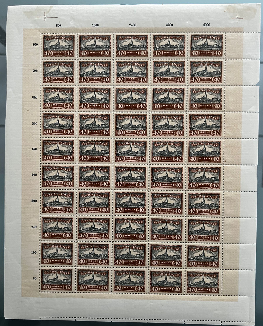 1927, Castles and Fortress, 5+5m- 40+40m, 100 complete sets of five, printed on horizontally or vertically (10m) laid paper, 5m, 10m and 12m are in sheets of 100 and each of 20m and 40m are in two sheets of 50, occasional selvage separations possible, full OG, NH, VF and scarce in complete sheets, C.v. $300 as hinged singles, Est. $150-$200, Scott #B15-19