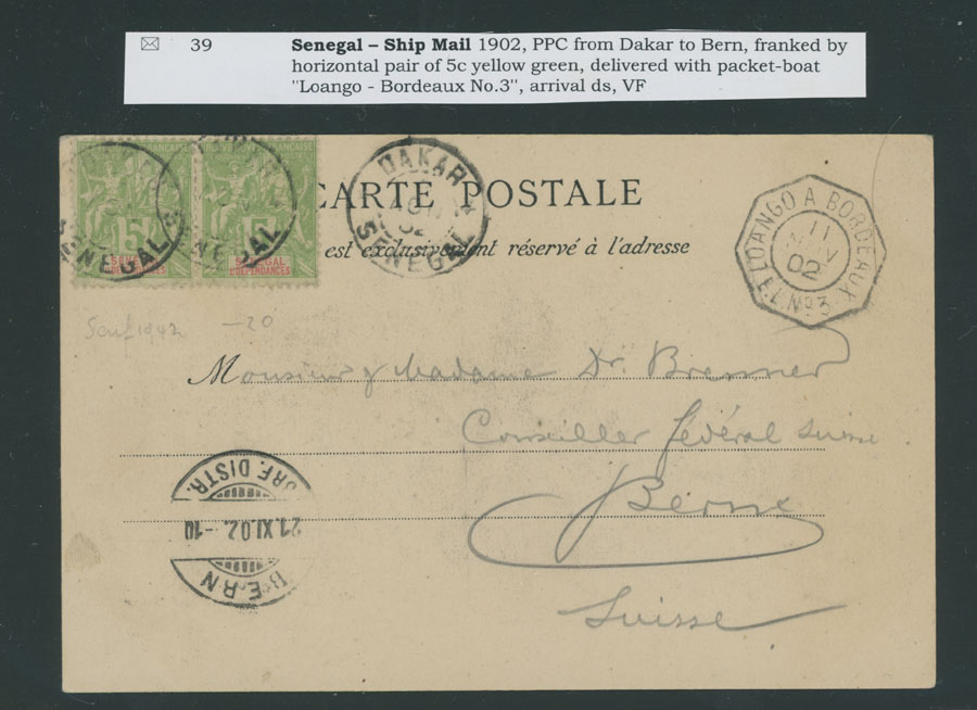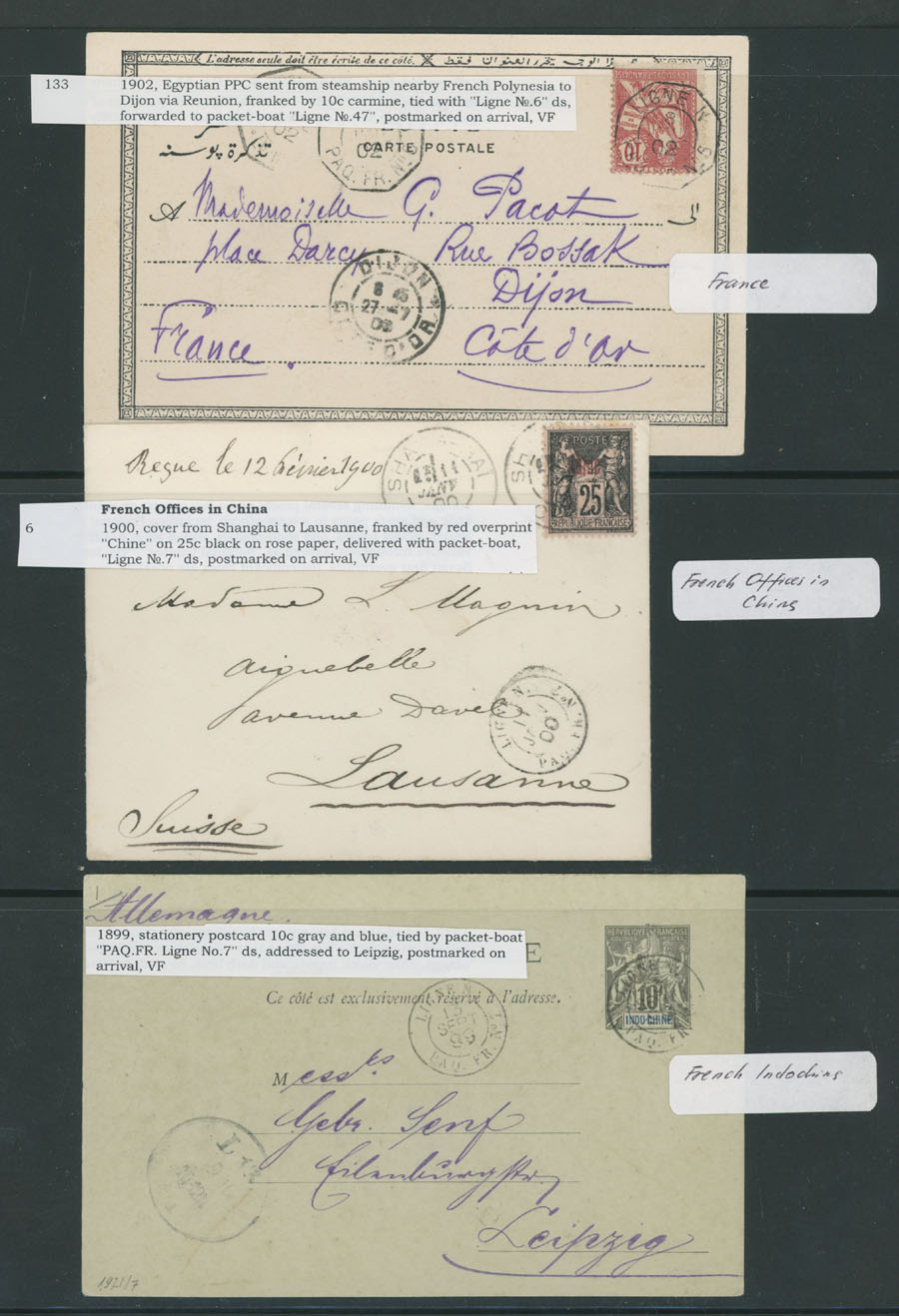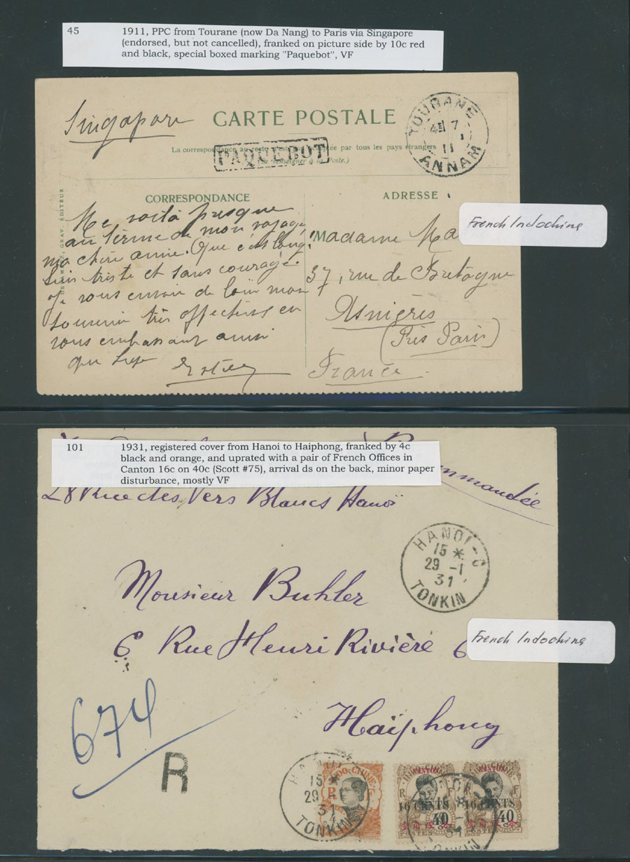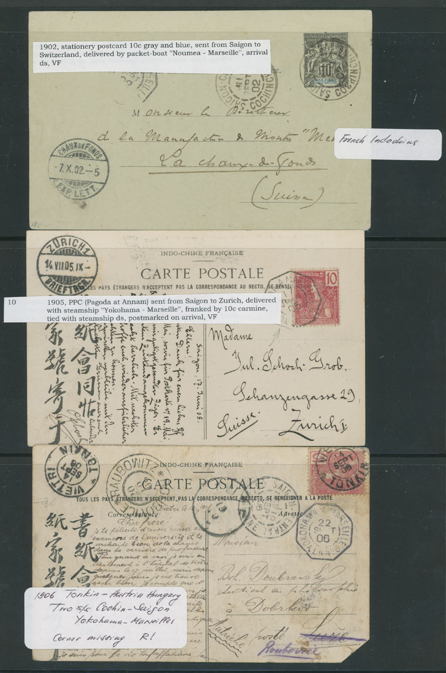SHIP MAIL COLLECTION: 1899-1931, nine postal history items including two covers and seven postcards or stationery postcards (2), neatly identified on stockpages, representing various ship cancellations, originated from Shanghai, Saigon, Tonkin, Tourane, Hanoi and Dakar, most is addressed to Europe, minor conveyance flaws possible, generally F/VF or better, Est. $300-$400