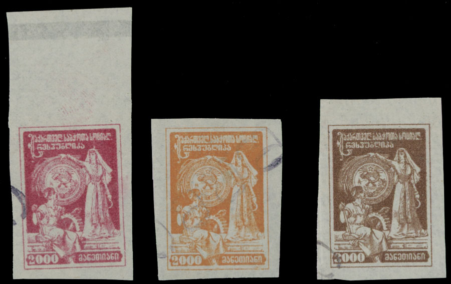 1922, Industry and Agriculture Allegory, three trial color imperforate proofs of 2000r in carmine, yellow and violet, each one with brown violet SPECIMEN overprint in Georgian, printed on white wove paper, no gum as issued, NH, VF and rare, Est. $500-$600, Scott #28