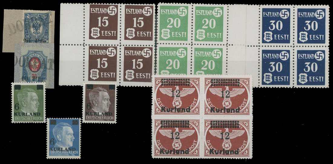1918-43, Dorpat 20pf on 10k and 40pf on 20k, postal cancellations (Mi #1-2), Estonia – Arms and Swastika, 15(k)-30(k), complete set in blocks of four on chalk-surfaced paper (Mi. #1x-3x) and Kurland surcharges ”6” on Hitler’s Head and ”12” on German Fieldpost in block of four (Mi #1-3, 4B), last two issues with full OG, NH, VF, Mi C.v. €869++, Est. $300-$350