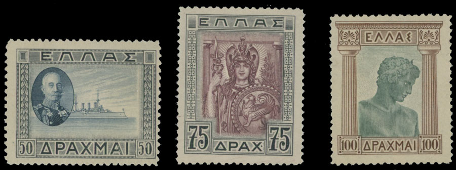 1933, Republic issue, 50d, 75d and 100d, complete set of three, full OG, NH, F/VF, C.v. $1,800, Karamitsos 523-25, C.v. €2,100, Est. $800-$900 , Scott #378-80