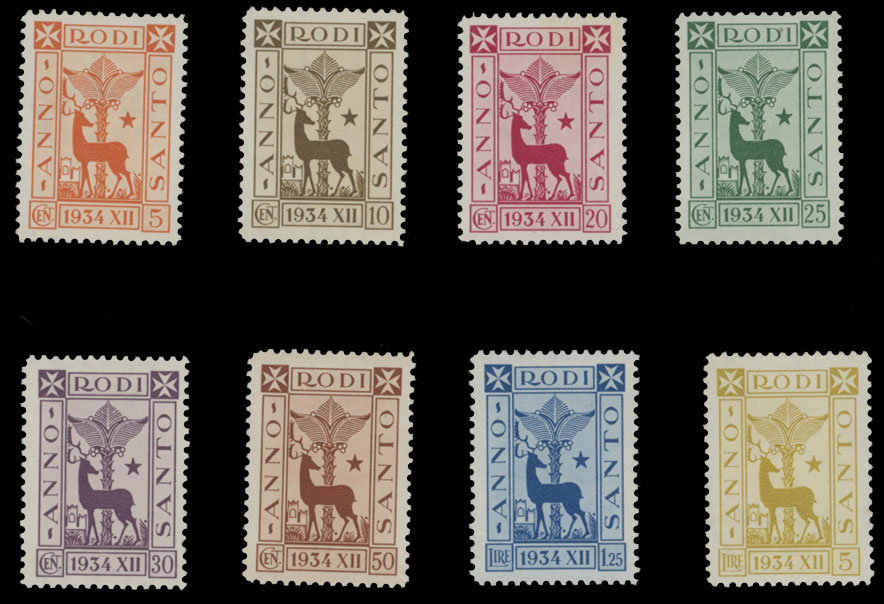 1935, Holy Year, Dear and Palm Tree, 5c-5L, complete set of eight, full OG, NH, VF, C.v. $1,072.50, Sassone #74-81, C.v. €1,625, Est. $300-$350 , Scott #74-81