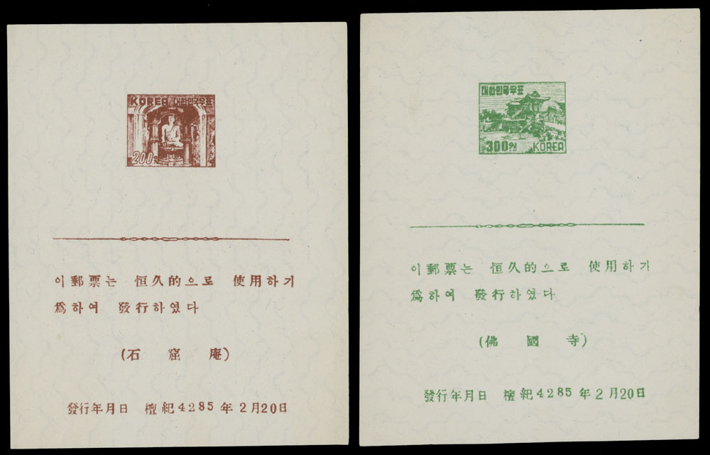 1952, Sok Kul Am, 200wn red brown, Bool Gook Temple, 300wn green, complete set of two presentation sheets, litho printing, vertical or horizontal Wavy Lines watermark respectively, no gum as issued, red brown sheet with minor offset on reverse, NH, VF and rare, only 300 sets were produced, Mi Blocks 49-50, C.v. €2,500, Est. $600-$700, Scott #186A- B var