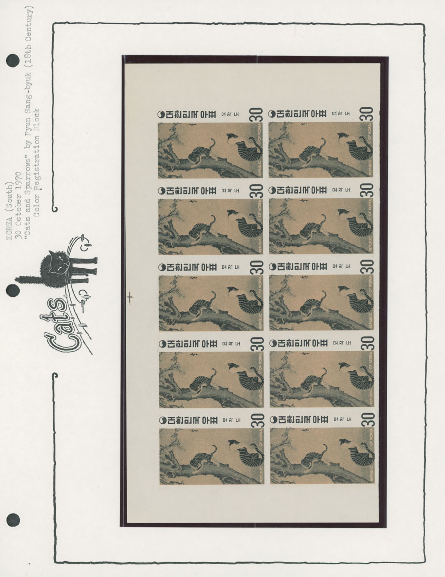 1970, ”Cats and Sparrows” by Pyun Sang-byuk, 30w multicolored, three-side margin imperforate block of ten (5×2, top part of a sheet), no gum as produced, NH, VF and scarce multiple, mounted on page from a Collection, KPC #C438a, C.v. 900,000KRW=US$635 as singles, Est. $200-$250, Scott #719 imp