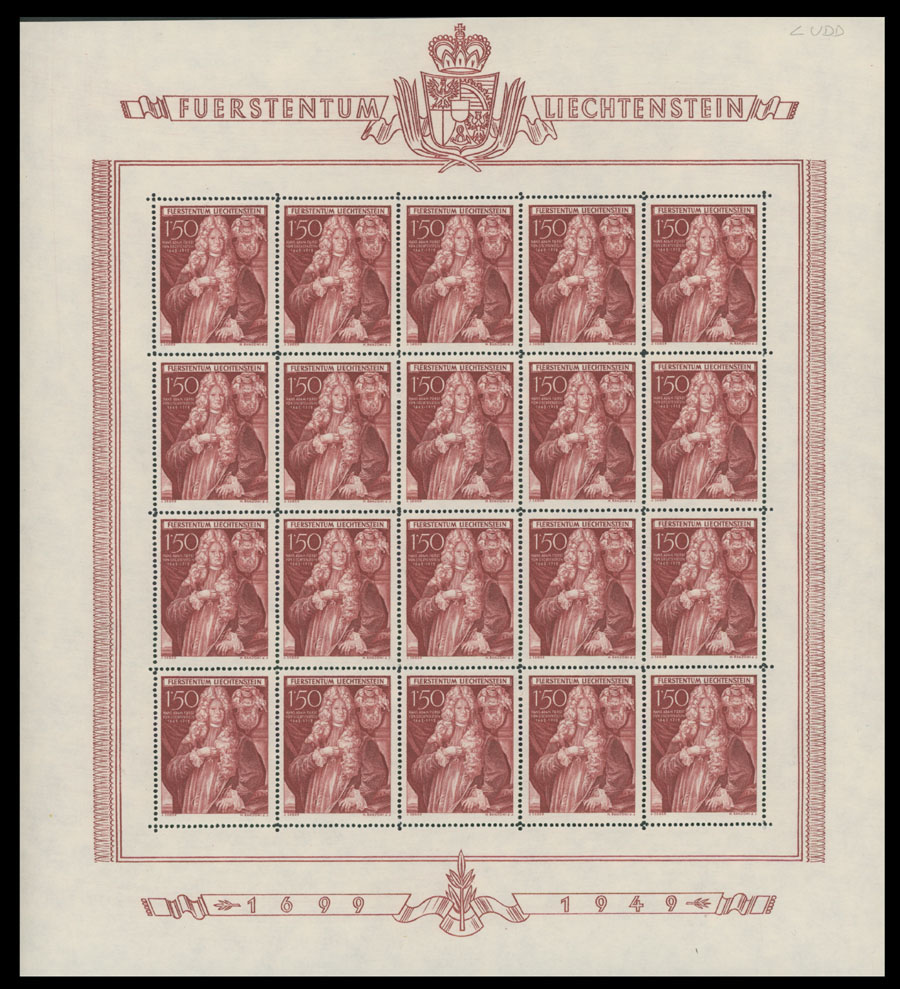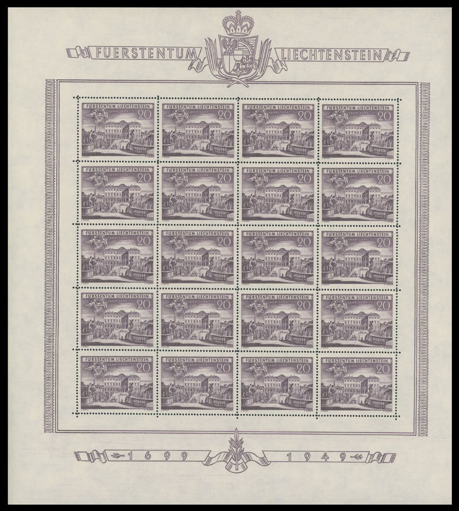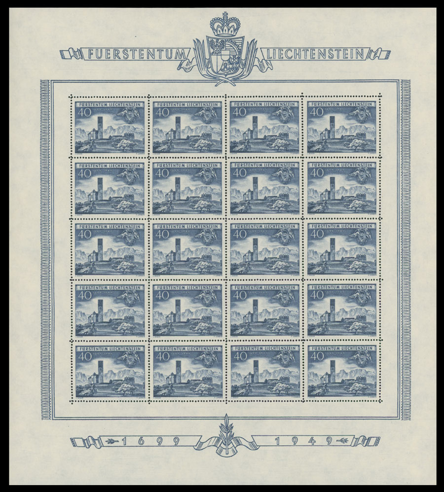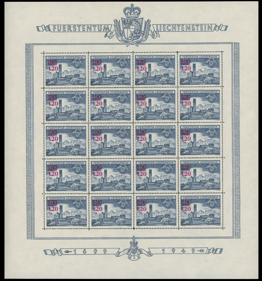 1949, Prince Johann and Castles, 20rp, 40rp and 150rp, complete set of three and Church in Bendern surcharged in red 1.20fr on 40rp blue, all are in sheet of 20, full OG, NH, VF, C.v. $880++, SBK#228-30, 254, C.v. CHF1,500 as singles, Est. $300-$350, Scott #240-42, 265