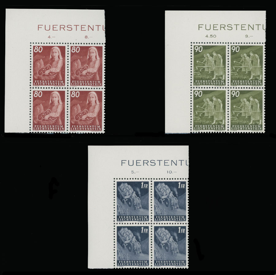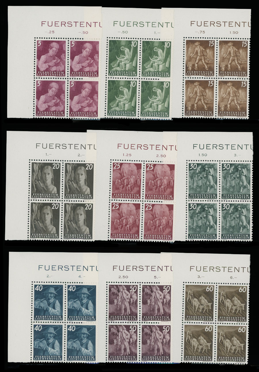 1951, Agriculture, 5(rp)-1fr, complete set of 12, top left corner sheet margin blocks of four, full OG, NH, VF, C.v. $440++, SBK #236-47, C.v. CHF800 as singles, Est. $150-$180 , Scott #247-58