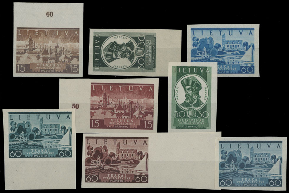 1940, Return Vilnius to Lithuania, 15c, 30c and 60c, imperforate complete set of three and five imperforate trial color proofs of 15c in red brown, 30c in emerald green and three of 60c in greenish blue, lilac brown and gray blue, the last one with small part of gum skip, all with full OG, NH, VF, Est. $200-$250, Scott #314-16