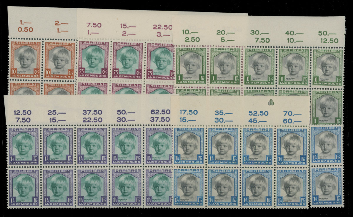 SEMI – POSTAL ISSUES: 1931, Princess Alix, 10c+(5c) – 1.75fr+(1.50fr), complete set of five, top sheet margin blocks of ten (the high value in block of 8 and vertical pair), full OG, NH, VF, C.v. $850 as single sets, Est. $250-$300 , Scott #B45-49
