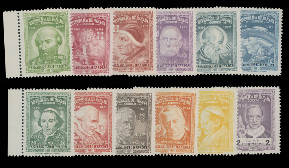 1955, Pope Pius issue, complete unissued set of 12, all with sheet margin at left, designed and produced by Jeffries Banknote Co., CA, full OG, NH, VF, Est. $100-$120 , Scott #403 fn