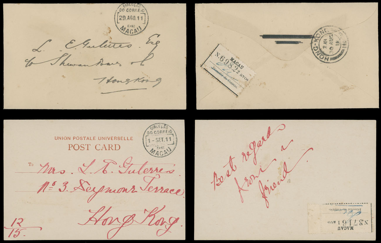 1911, postcard (September 1) and cover (August 30) sent from Macao to Hong Kong, franked on reverse by 1a (No.3716) and 2a (No.6982) respectively, first one with right sheet margin, not cancelled as always exists, mostly VF and rare, C.v. $1,050 as for used stamps off correspondences, Est. $800-$1,000, Scott #162-63