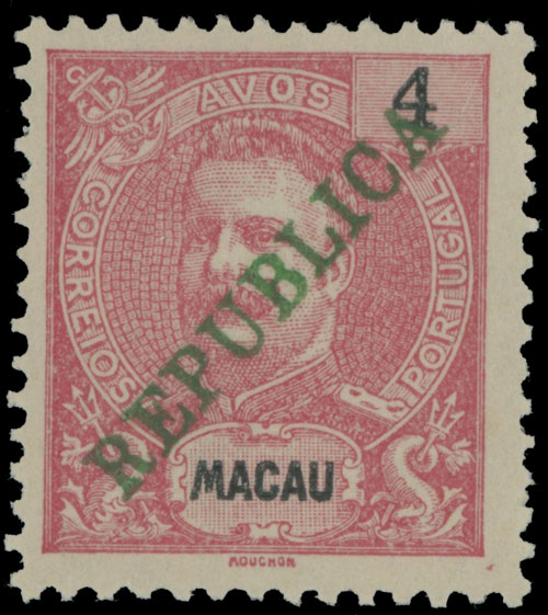 1913, green diagonal overprint ”REPUBLICA” on King Carlos stamp of 4a carmine, no gum as issued, NH, VF, C.v. $400, Est. $300-$350 , Scott #195