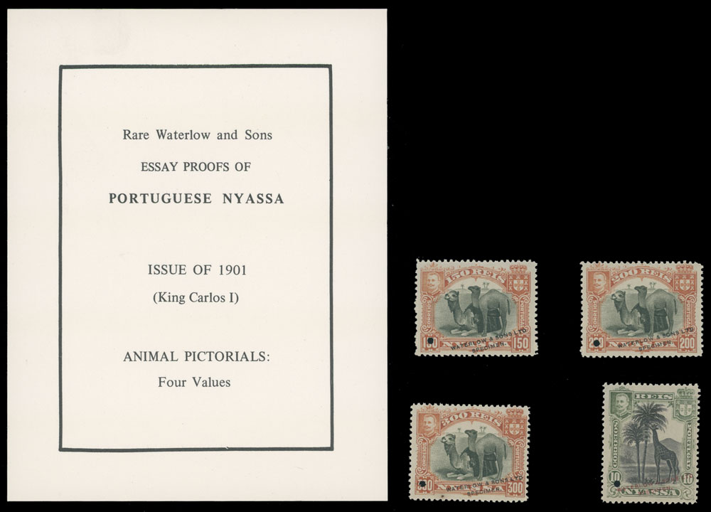 1901, Giraffe 10r green and black (reversed colors compare to issued stamp), Camels 150r, 200r and 300r, each one in orange and black, four trading proofs (essays), each one with puncture at left and black or red two-line overprint, no gum as produced, VF and rare, original Waterlow and Sons, Ltd card is enclosed, Est. $300-$350, Scott #28, 36-38
