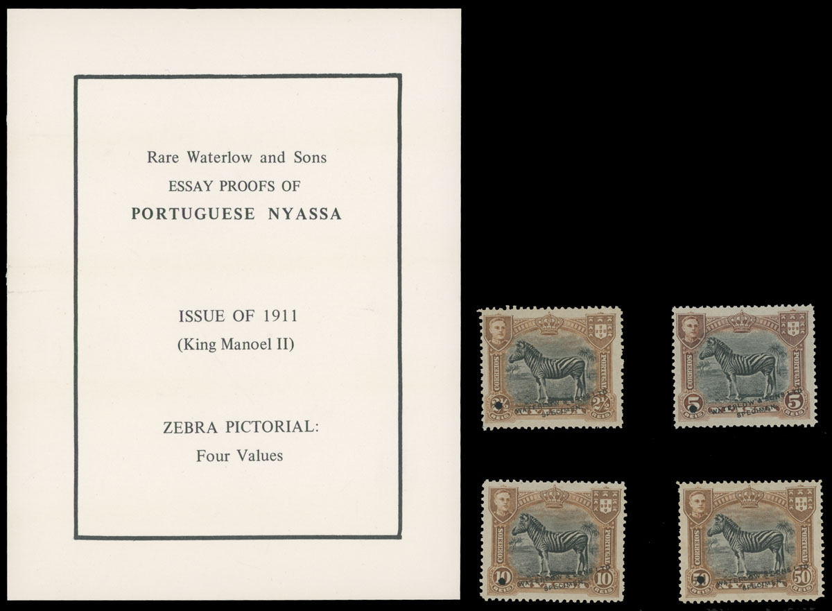 1911, Zebra 2½r, 5r, 10r, and 50r, four trading proofs (essays) in light brown and black, no diagonal overprint, each one with puncture at left and black two-line overprint, no gum as produced, VF and rare, original Waterlow and Sons, Ltd card is enclosed, Est. $300-$350, Scott #51/56