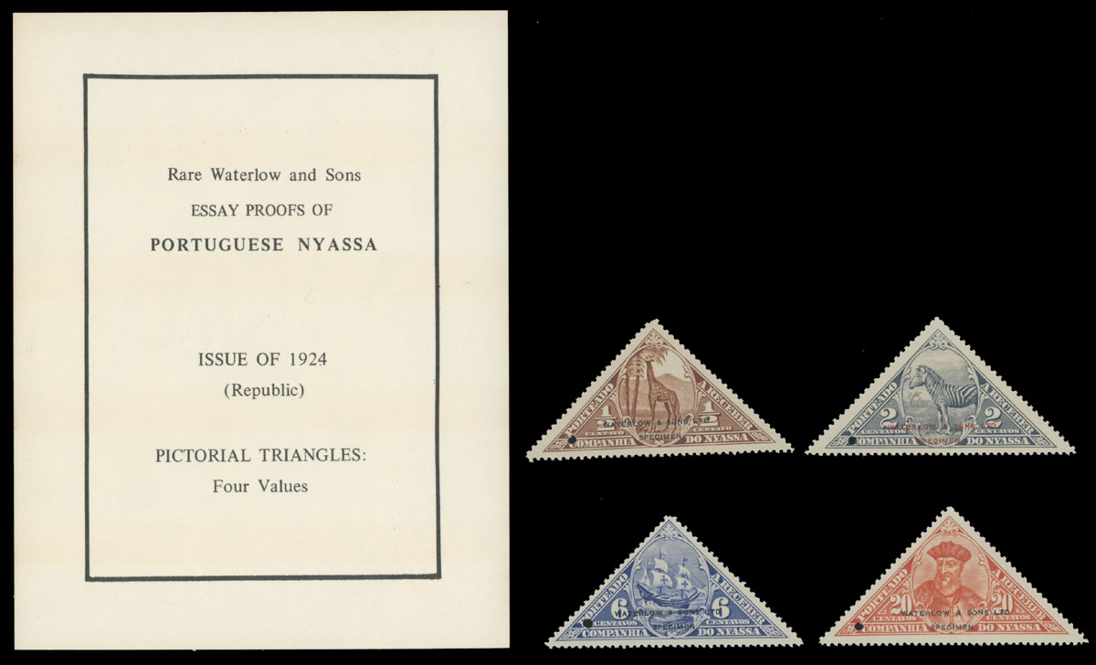 1924, Giraffe ½c in yellow brown, Zebra 2c gray violet, ”San Gabriel” 6c ultra and Vasco da Gama 20c orange, four trading triangle proofs (essays), each one with puncture at left and black two-line overprint, no gum as produced, VF and rare, original Waterlow and Sons, Ltd card is enclosed, Est. $300-$350, Scott #J1/J8