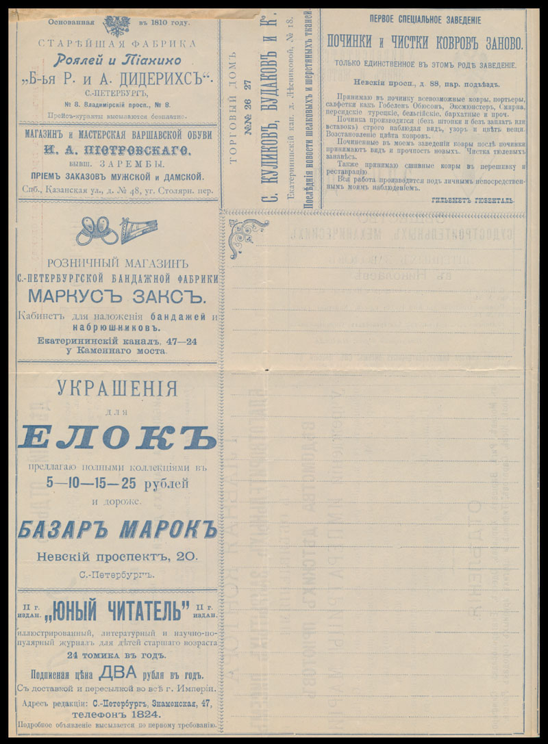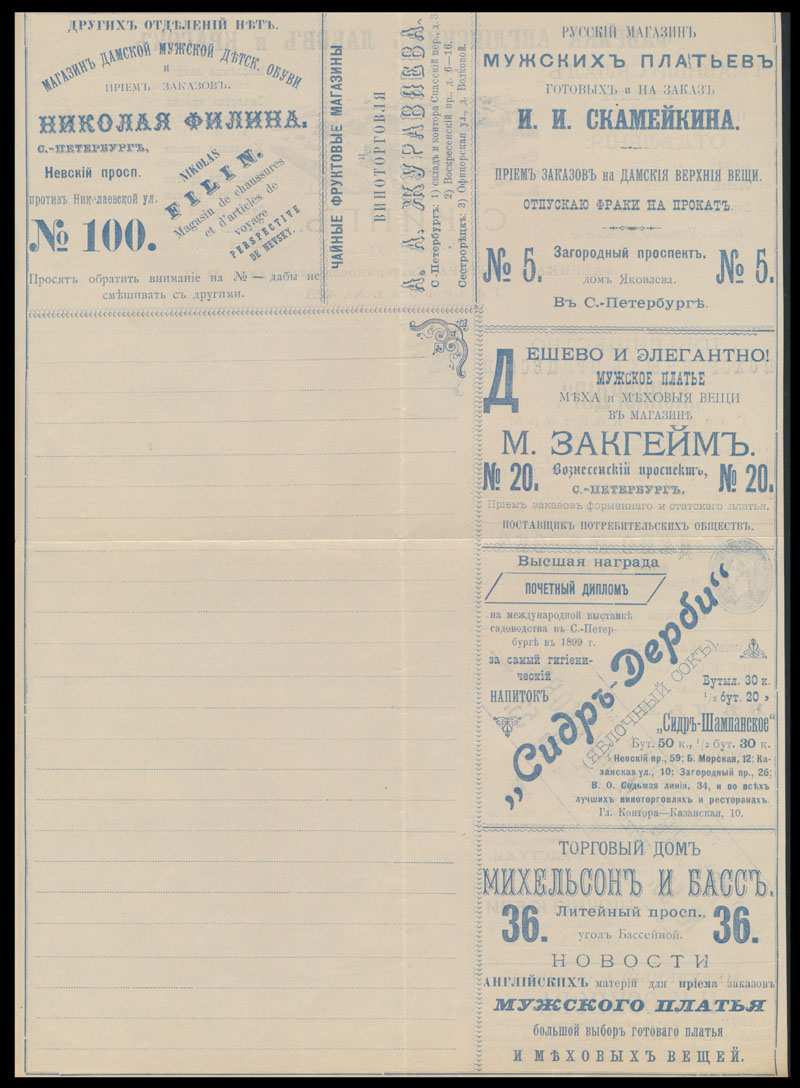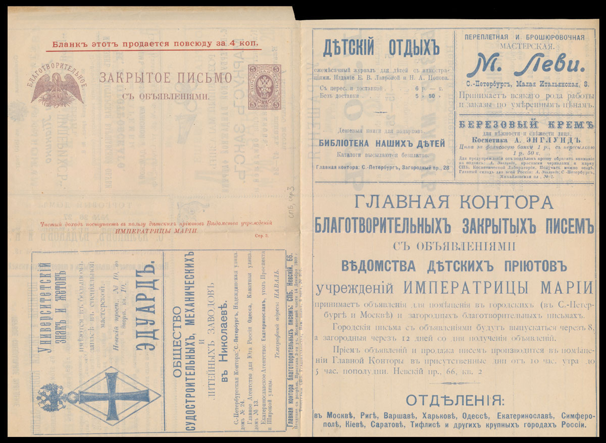 1899, 5k brown, unused letter-sheet of series 3 (local), printed in St. Petersburg, containing 25 various advertisements inside and on reverse, usual folds, fresh and VF, ex-Vadim Ustinovsky, Est. $500-$600