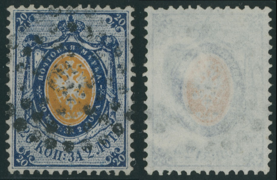 1858, 20k blue and orange, perforation 14½x15, printed on thin paper with numeral watermark ”2” shifted to the left, ”38” inside circular dotted cancellation (Riga), fresh colors and intact perforation, VF, C.v. $1,700, Est. $600-$700, Scott #3