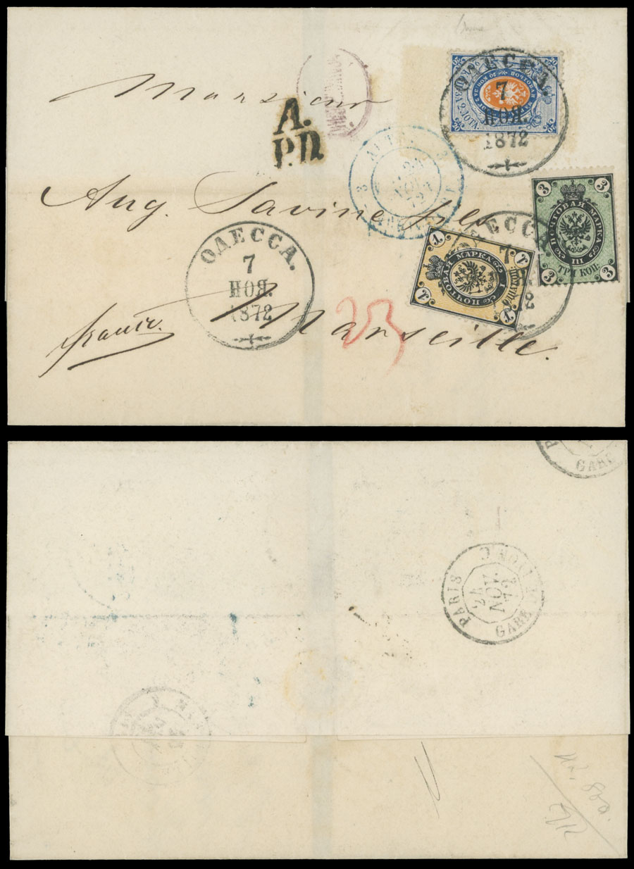 1872 (November 7 – Julian Calendar), entire wrapper from Odessa to Marseille, franked by 1k and 3k on horizontally laid paper and 20k – on vertically laid paper, met 24k postal rate, appropriate transits and arrival markings on front and reverse, mostly VF, C.v. $850++, Est. $300-$400, Scott #19-20, 24a
