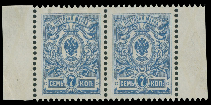 1908, plate proof of 7k in light blue, perforation 14½x15, two-side margin horizontal pair with 3 pearls at left on each stamp, printed on wove paper with vertical varnish lines, no gum as produced, VF and very rare, Est. $4,000-$5,000 , Scott #78