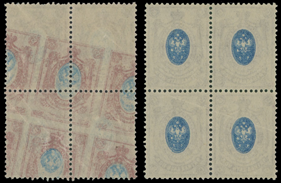 1912-17, 15k red brown and blue, 15k violet brown and blue, two blocks of four, first one with misplaced full offset of the design, the other one with offset of center, full OG, NH, VF, Est. $100-$120 , Scott #81, a var