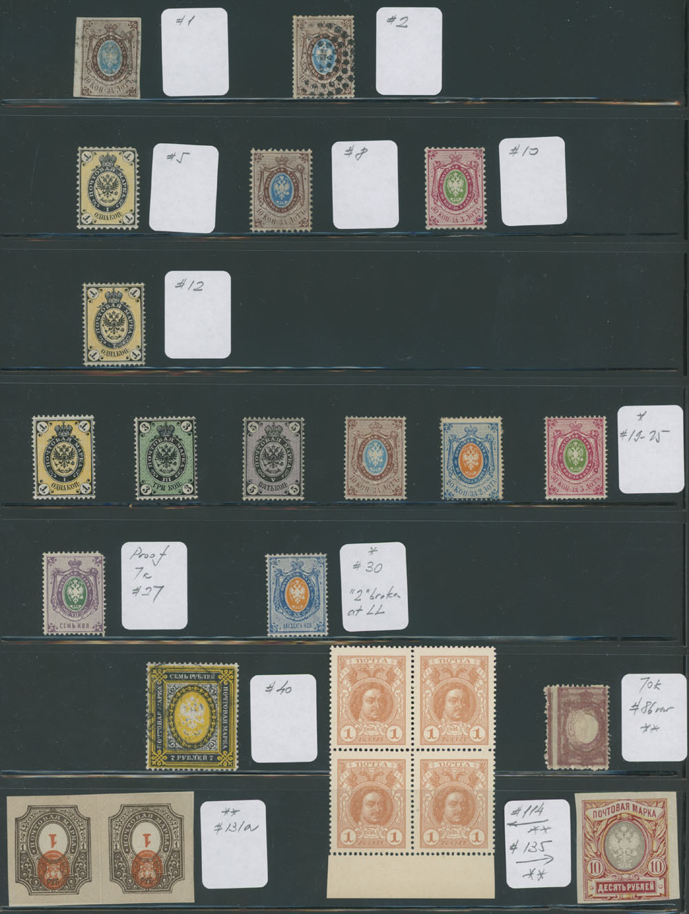 1857, about two dozens mostly mint stamps (3 used – No.1-2 and 40), including perf 12 – 1k, 10k and 30k, perf 14½x15, no watermark – 1k; then 1k-30k on horizontally laid paper, proof of 7k and stamp of 20k from 1875-79 issue, flawless money stamp of 1k in block of four and several other nice varieties, early stamps are regummed or heavily hinged (used 7r is flawless and signed), generally F/VF and high potential group, Est. $600-$700, Scott #1/135