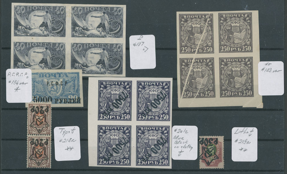 1921-23, 16 mint stamps, including 250r in block of four with pre-printed fold, proof of 40r in gray in block of four, seven inverted surcharges – blue black 7500r on 250r on chalk-surfaced paper in block of four and three ”Star” inverts, fresh quality unit, full OG or no gum as produced, mostly NH, VF, Est. $300-$350, Scott #183/219a