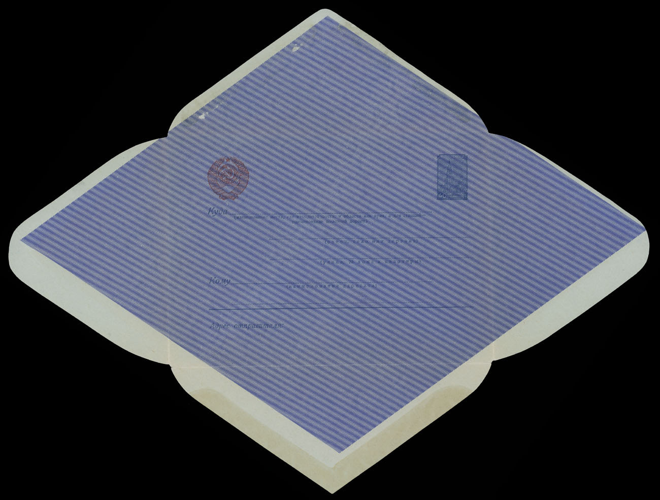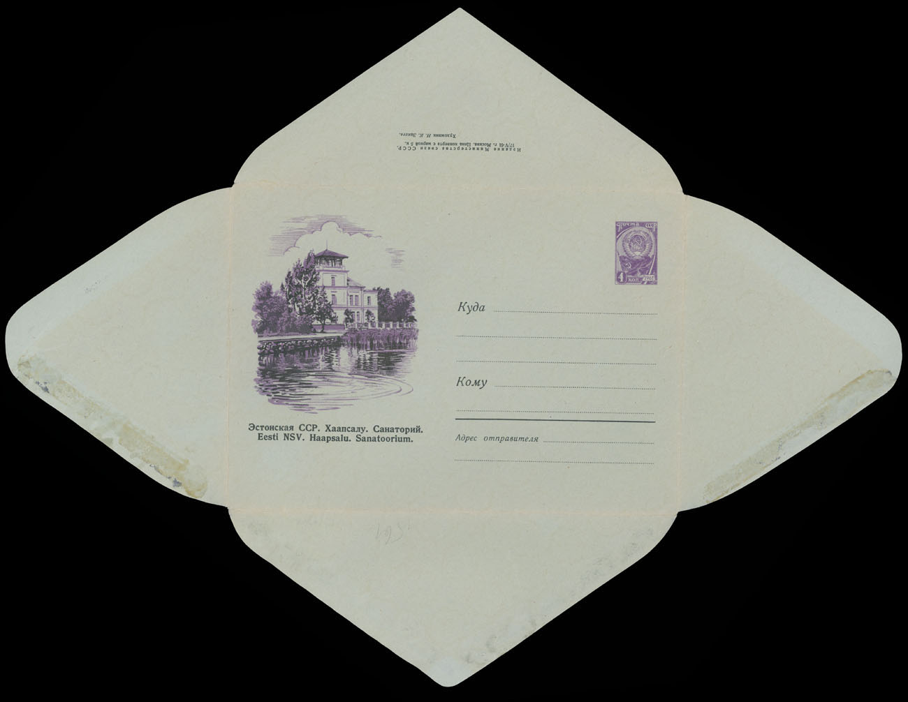 1961, Haapsalu Sanatorium in Estonia, stationery envelope 4k lilac printed on gray blue paper with watermark Octagon, Coat of Arms in red, stamp of 40k and address guide in blue printed inside, opened for display, VF and rare, Est. $200-$250