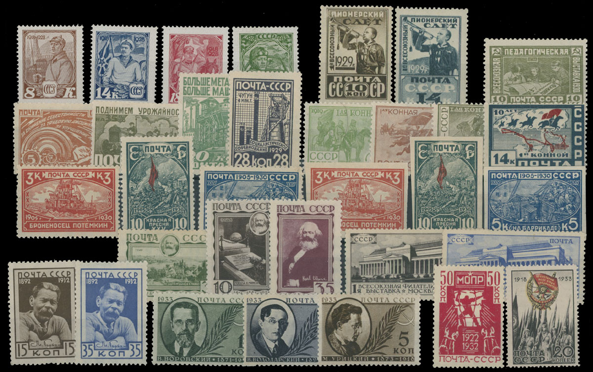 1928-33, Red Army, Pioneers’ Assembly, Industrialization, Cavalry Army, Revolution of 1905, Karl Marx, Philatelic Exhibition, M. Gorky and etc., 13 complete issues, the total is 33 stamps, all with full OG, NH, mostly VF, C.v. $912, Est. $300-$400, Scott #402/518