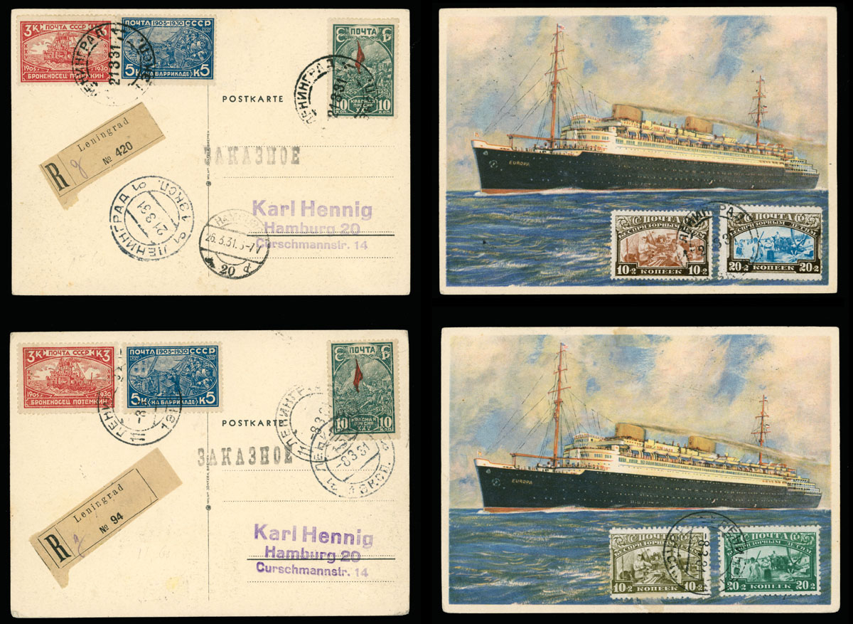 1930, two color postcards (MS ”Europa”) sent by registered mail from Leningrad to Hamburg, each one franked by perforated complete set of the Revolution of 1905 on address part and Child Welfare set of two of 1929or 1930 respectively on picture side, appropriate markings, one with Hamburg arrival ds, VF, Est. $200-$250, Scott #438-40, B54-57