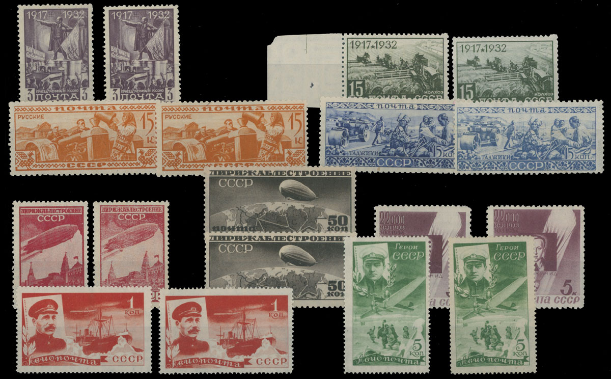1932-35, October Revolution 3k and 15k, Ethnographic issue 15k orange and 15k ultra; Dirigibles of 1931 – 20k and 50k, Usyskin 5k and Chelyuskin Rescue 1k and 5k, nine couples with vertical or horizontal positions of watermark Borders and Rosettes, full OG, NH or LH (3), mostly VF, Est. $300-$350, Scott #472/501, C22/C60, var