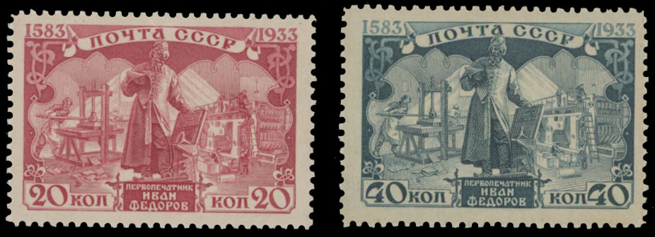 1934, Ivan Fedorov, Founder of Printing in Russia, 20k carmine and 40k slate blue, complete set of two, nice centering, full OG, NH, VF, C.v. $143, Est. $80-$100 , Scott #529-30
