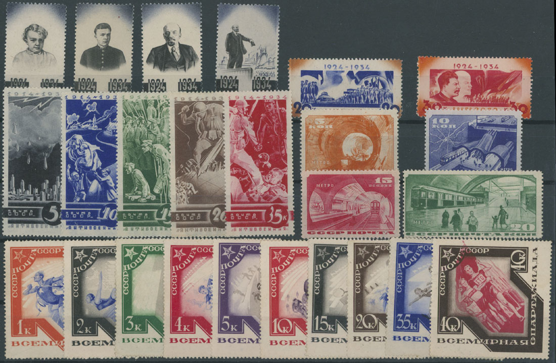 1934-35, 10th Anniversary of the Lenin’s death, Anti-War Propaganda, Moscow Subway and Moscow Spartacist Games, four complete sets, the total is 25 stamps, full/large part of OG, mostly VF, C.v. $1,777, Est. $600-$700 , Scott #540/69