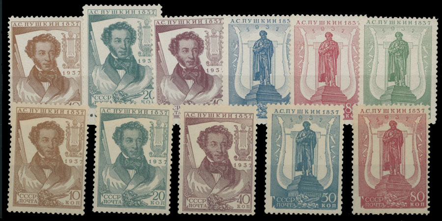 1937, Alexander Pushkin, 10k-1r and 10k-80k, two complete sets of six and five respectively, first one with perforation L12½, the other one printed on ordinary paper with comb perforation 12×12½, full OG, NH, mostly VF, C.v. $355, Est. $200-$250, Scott #590-95, 590A- 94A
