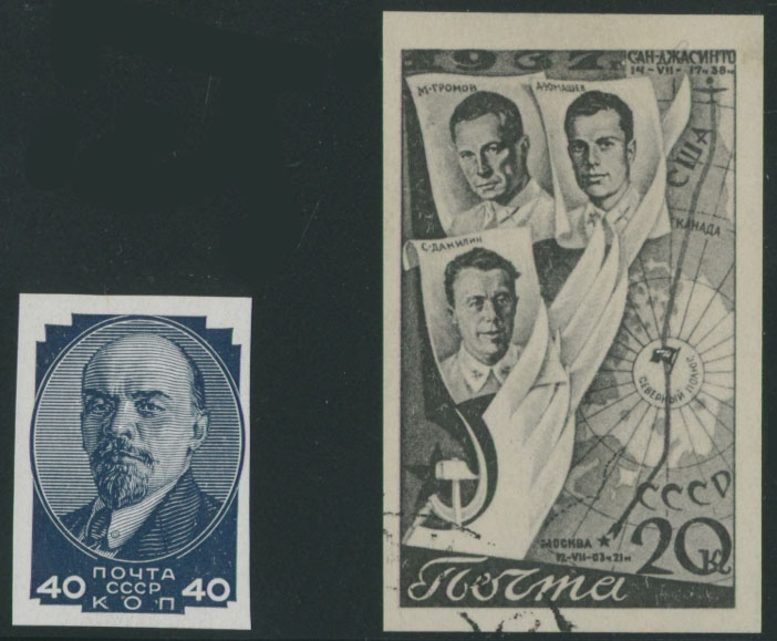 1938, Lenin 40k dark blue and 2nd Trans-Atlantic Flight 20k gray black, two imperforate singles, full OG, NH or slight CTO cancellation, VF, Est. $300-$350 , Scott #619b, 641a