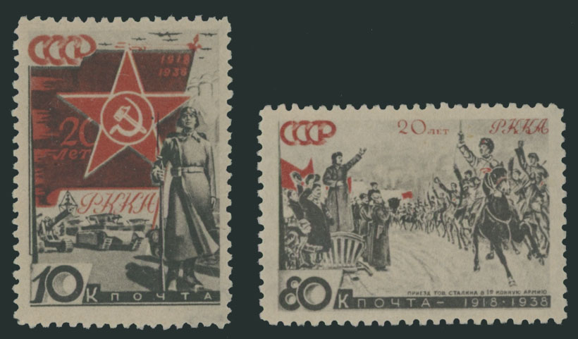 1938, 20th Anniversary of the Red Army, 10k and 80k, two stamps printed on ordinary paper, full OG, LH, VF, ex-V. Ustinovsky, Est. $100-$150 , Scott #629, 634 var
