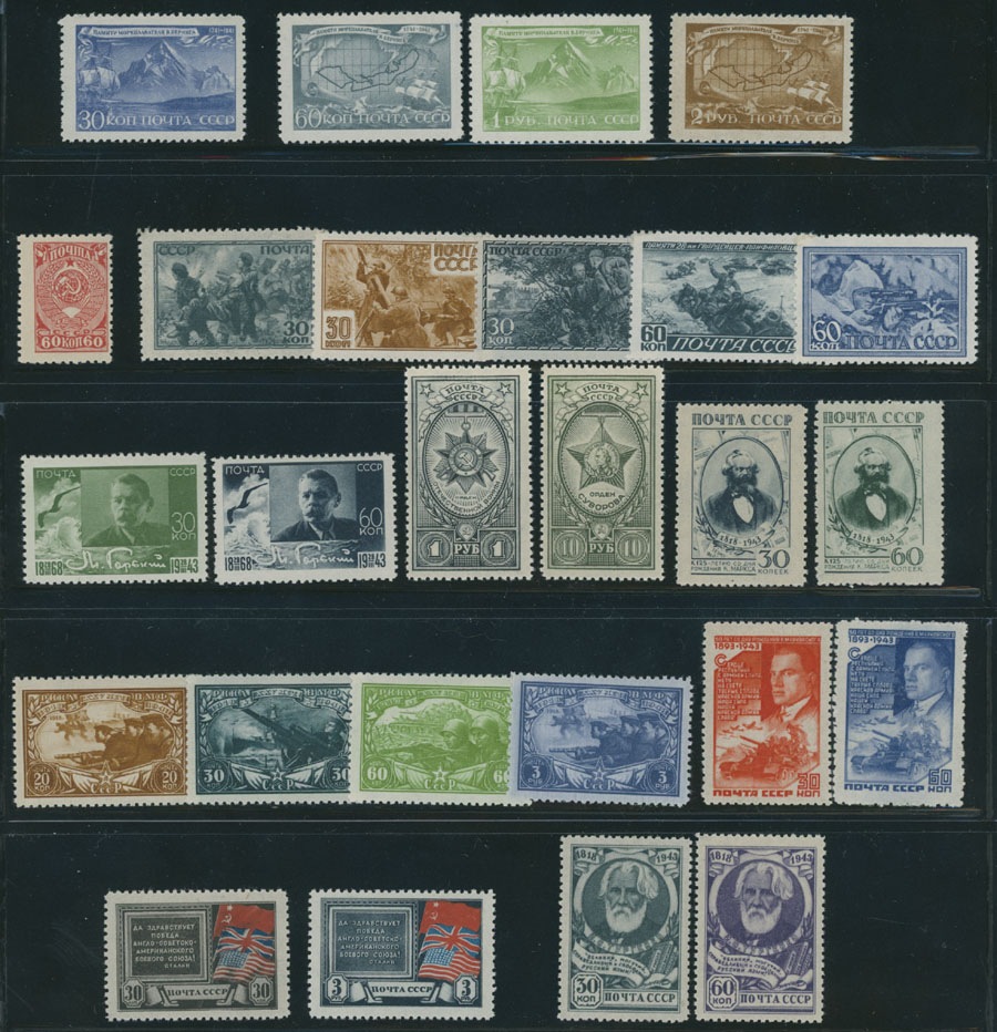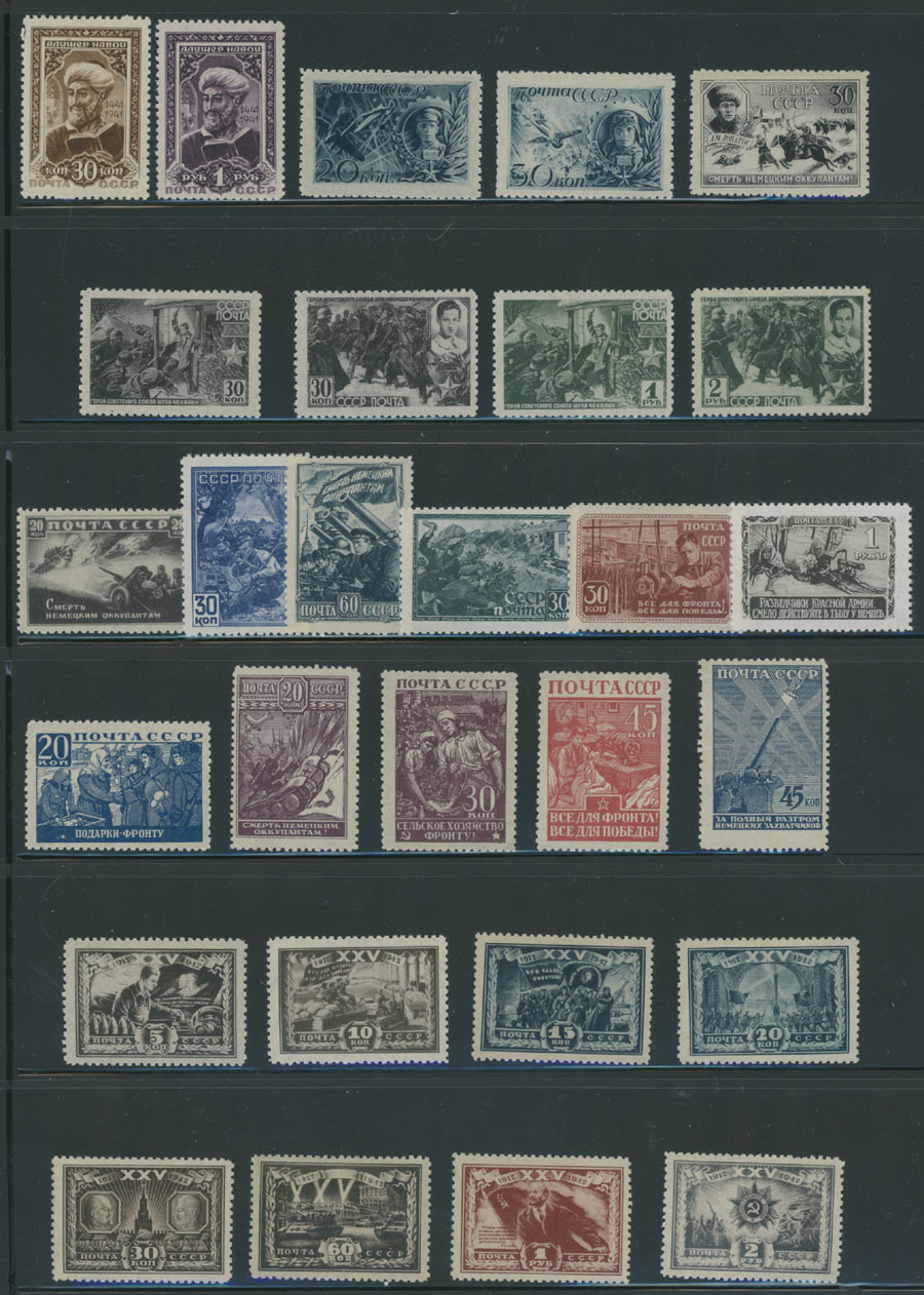 1942-43 Years, complete set of 54 stamps (14 issues), starting with A. Navoi set of two and all World War II issues of this years, full OG, NH, mostly VF, C.v. $829, Est. $400-$500 , Scott #857/910