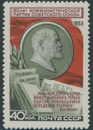 1953, 50th Anniversary of Communist Party, 40k multicolored, ghost double impression of magenta (inscriptions at top and bottom), full OG, NH, VF and scarce, only one sheet of 72 stamps with this error has been discovered, Est. $150-$180, Scott #1678 var