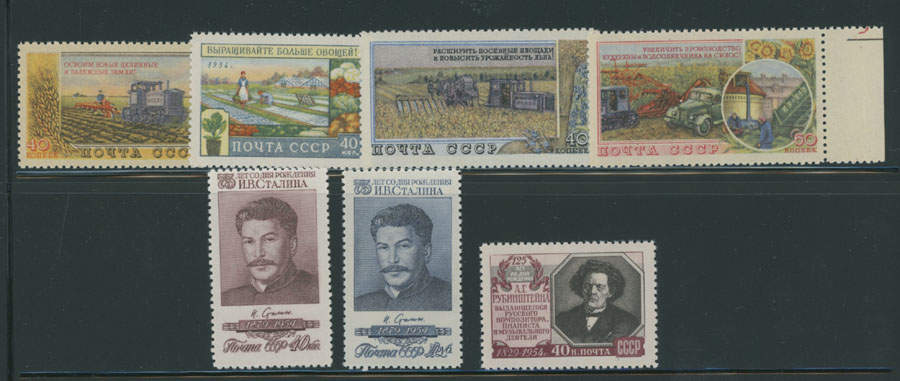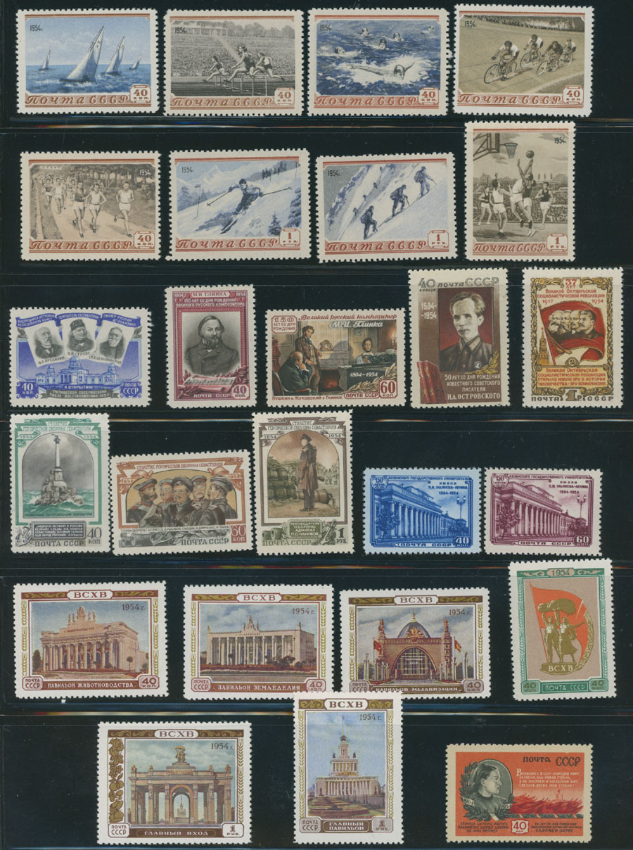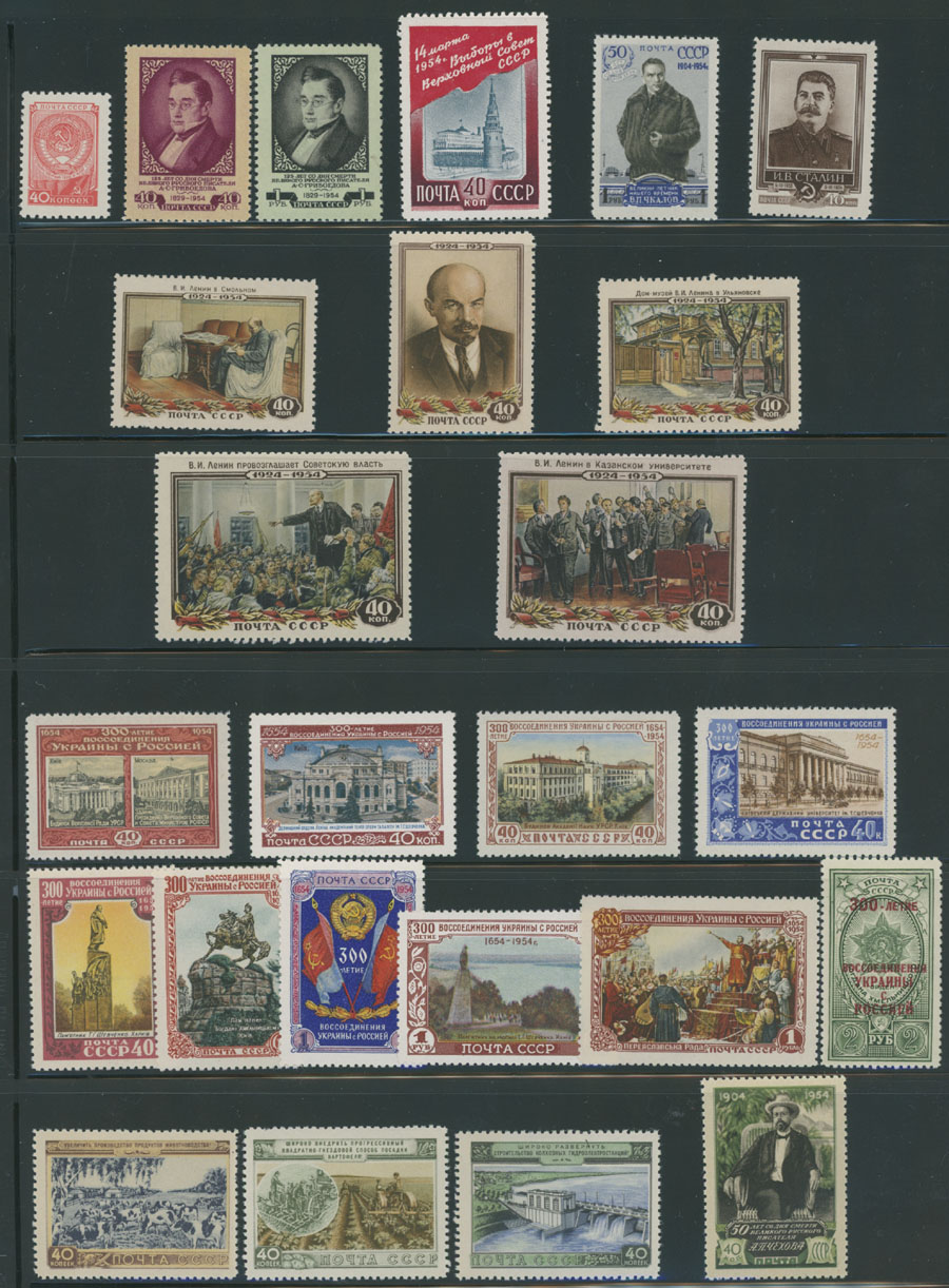1954 Year, complete set of 57 stamps, including Stalin with perforation L12½, Ukraine, Sports and Agriculture Exhibition issues, full OG, NH, mostly VF, C.v. $278, Est. $150-$180 , Scott #1689- 745