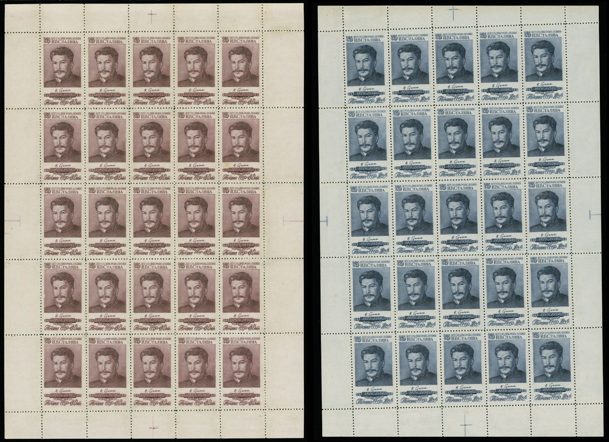 1954, 75th Anniversary of the birth of Stalin, 40k lilac rose and 1r gray blue, complete set of two miniature sheets of 25 (common sheets of 50 stamps), nice and unfolded, slightly uneven full original gum as always exists, NH, VF and rare, all stamps of 1r with Soviet Philatelic guarantee hs, Est. $4,000-$5,000, Scott #1743-44 var