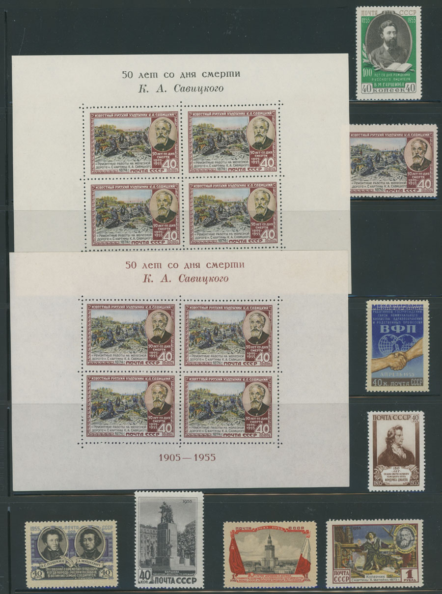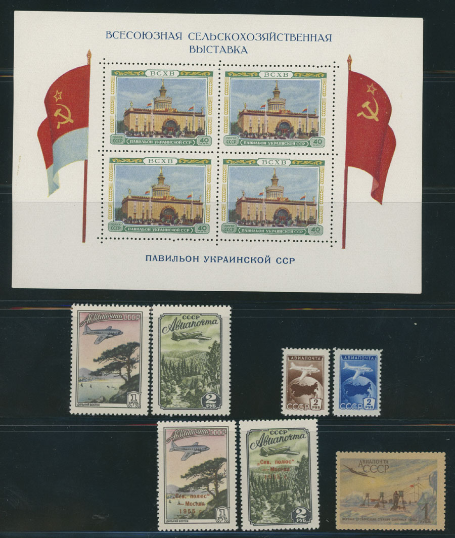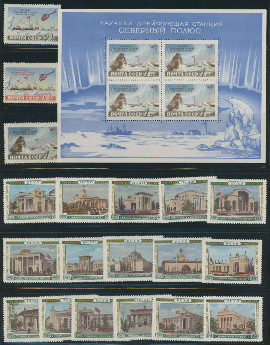 1955 Year, complete set of 49 stamps and 9 souvenir sheets, postage and air post, including North Pole Station sheet issued in 1958, all with full OG, NH, mostly VF, C.v. $370, Est. $200-$250 , Scott #1746-88, C91-97
