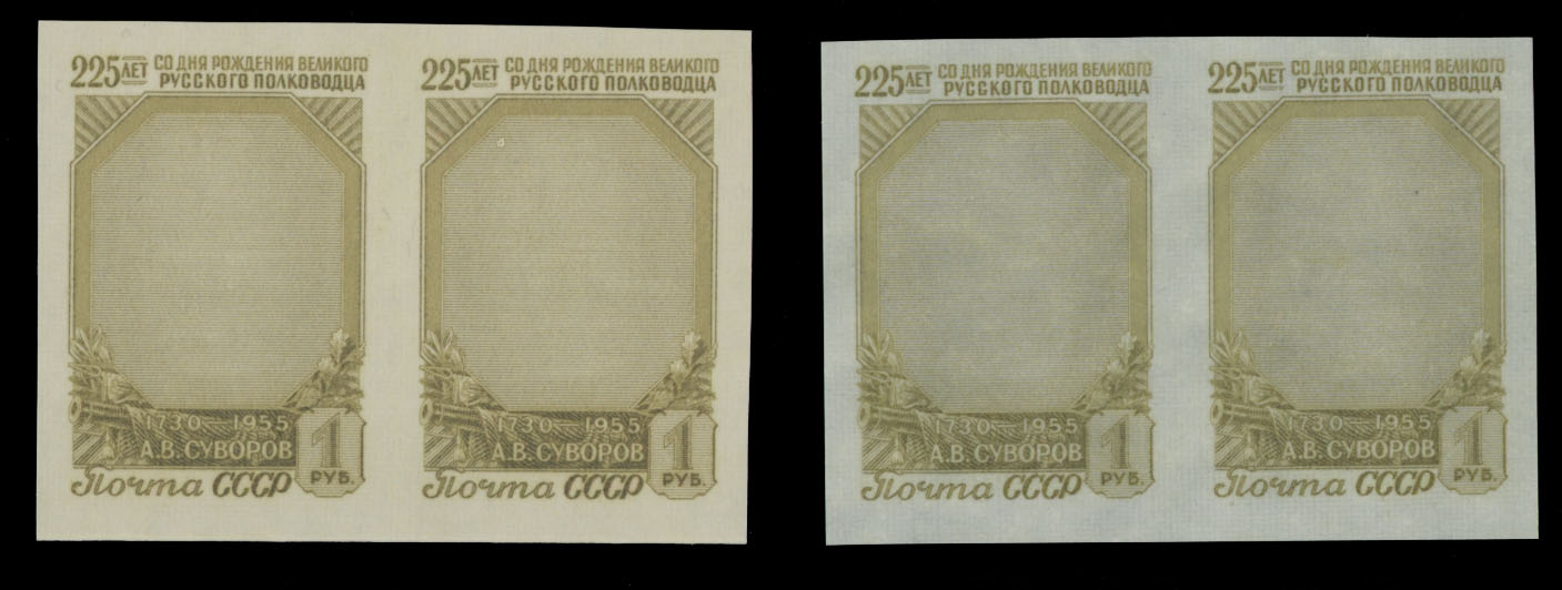 1956, Generalissimo Count Alexander Suvorov, imperforate proof of frame and background for stamp of 1r in olive green, two horizontal pairs printed on wove paper without watermark and on watermarked paper, no gum as produced, VF and rare, Raritan Stamps guarantee, Est. $1,000-$1,200, Scott #1889