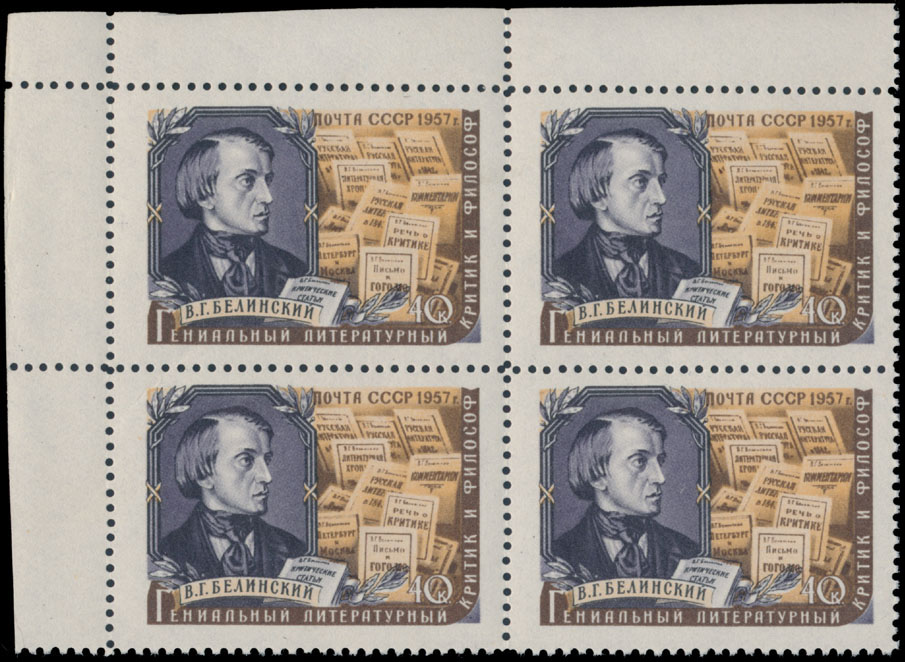 1957, Vissarion Belinsky, 40k multicolored, perforation L12½ instead of comb 12½x12, top left corner sheet margin block of four, post office fresh quality item, full OG, NH, VF and rare multiple, only a few such blocks recorded, Raritan Stamps guarantee, Est. $3,000-$4,000, Scott #1902 var