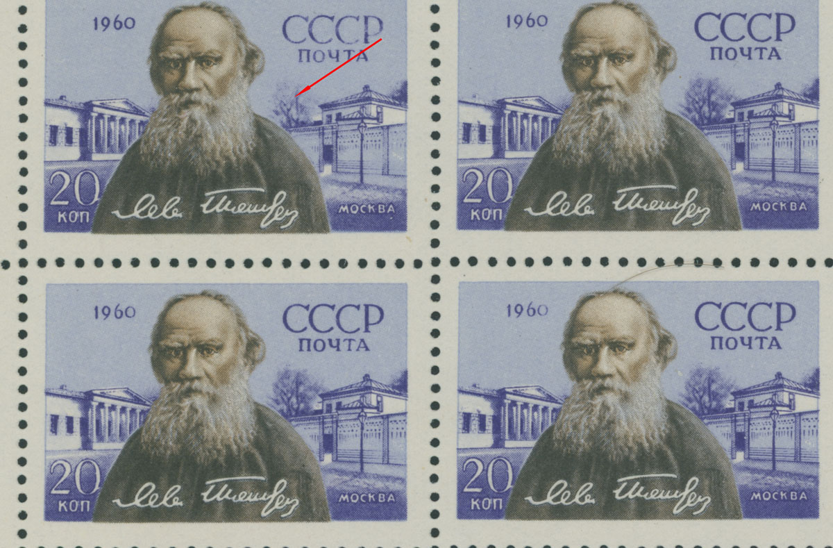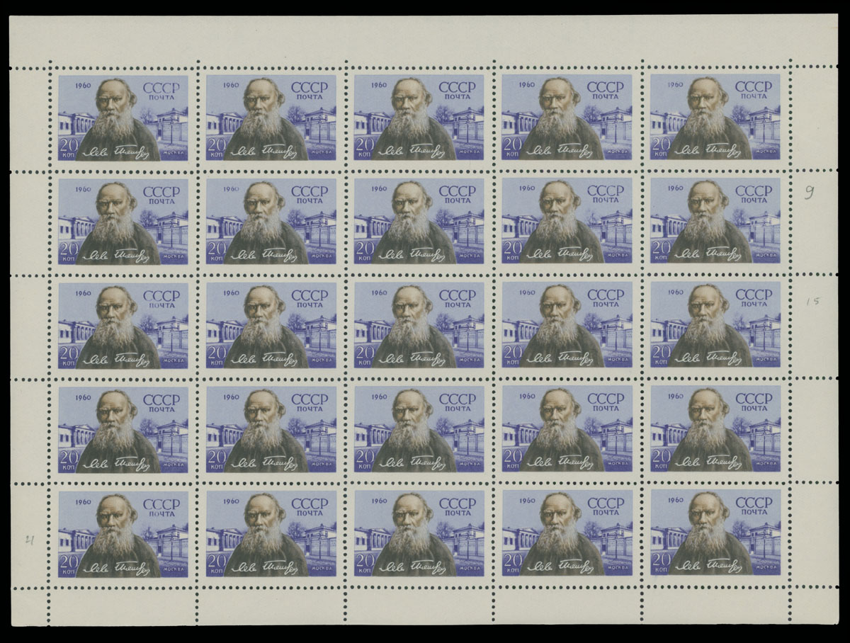1960, Leo Tolstoy, 20k violet and brown, complete sheet of 25 (5×5), ”tree without branches” variety on stamps from positions 1, 9, 15 and 21, full OG, NH, VF and rare in complete sheet, these error presents only in a small part of printing run, Est. $300-$400, Scott #2391 var
