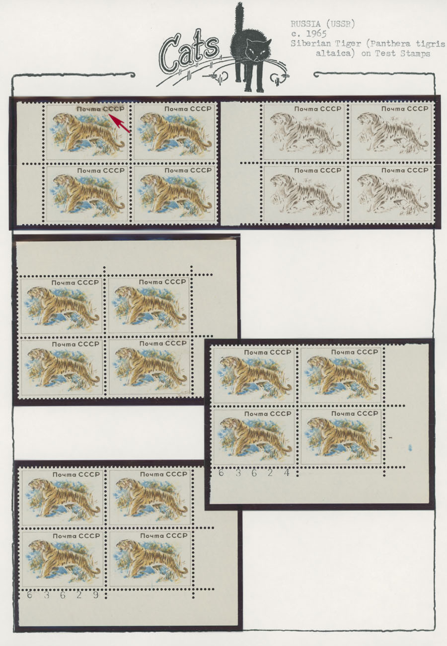 1960, Ussuri Tiger, multicolored test stamp with no value indicated, 4 sheet margin blocks of four (3 with corner margin) and left sheet margin block of four of brown color only, all with full OG, NH, VF, mounted on page from a Collection, Est. $400-$500