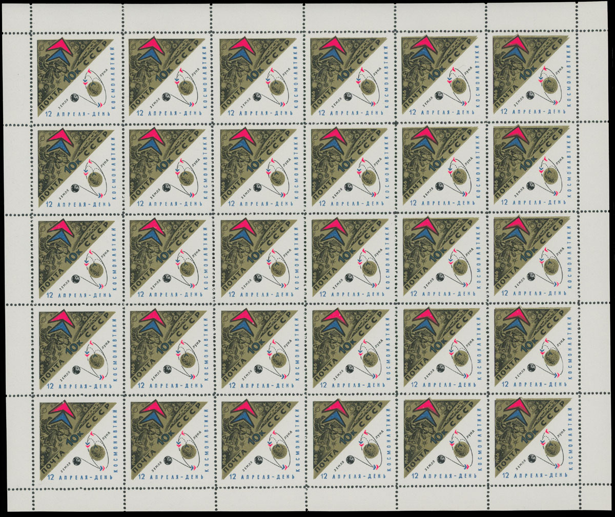 1965, Cosmonauts’ Day, 10k multicolored, transition sheet of 30 (6×5) includes more then a half stamps with double impression of gold color, unfolded and post office fresh, full OG, NH, VF and very rare, only a handful such sheets were found, no more then five remain unbroken, Est. $1,500-$2,000, Scott #3193, var