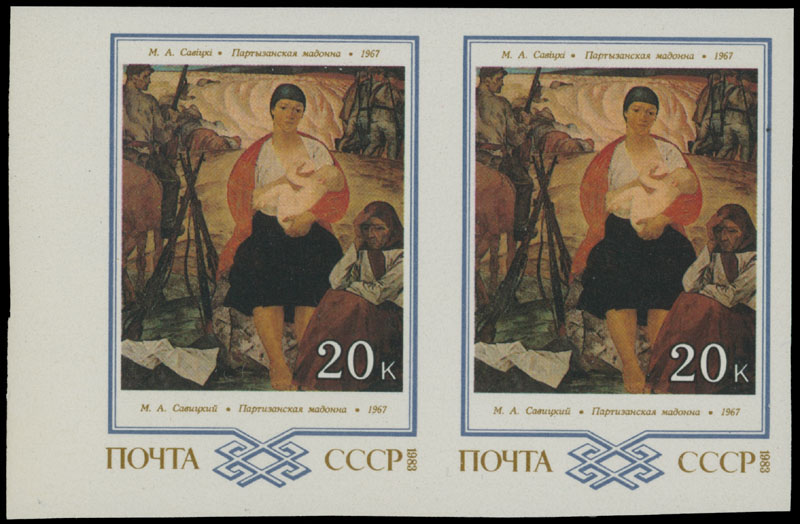 1983, Partisan Madonna by M.A. Savitsky, 20k multicolored, left sheet margin horizontal imperforate pair, full OG, NH, VF and rare, Est. $1,500-$1,800 , Scott #5187 imp