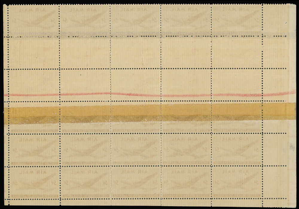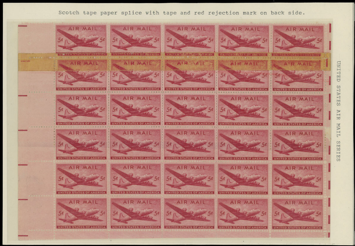 1946, DC-4 Skymaster, 5c carmine, three-side margin block of 30 (5×6, bottom part of a pane), at least 15 stamps have full or partial double paper variety with scotch tape paper splice on front (2nd row) and red rejection line with scotch tape on gum side (3rd and 4th rows), full OG, NH, VF and very rare, Scott #C32 var, Est. $500-600, Scott #C32 var